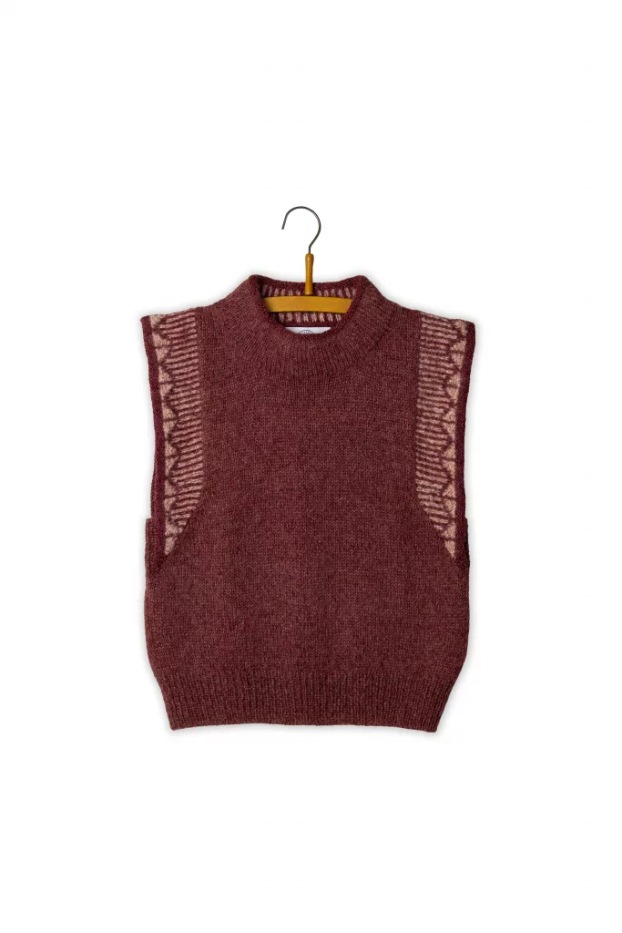 Nachdem die Wahl auf dieses Muster gefallen war, entwickelte sich die Idee zu den charakteristischen „Flügeln“ der Weste fast von selbst. Diese Flügel verleihen dem Slipover ihren besonderen Charakter: Sie betonen die Schulterpartie und erzeugen so eine kraftvolle Silhouette, während zugleich die filigranen Details und die kontrastreichen Garnstrukturen – eine Mischung aus flauschigen und glänzenden Qualitäten – einen femininen Ausdruck schaffen und den Rapport klar hervorheben.