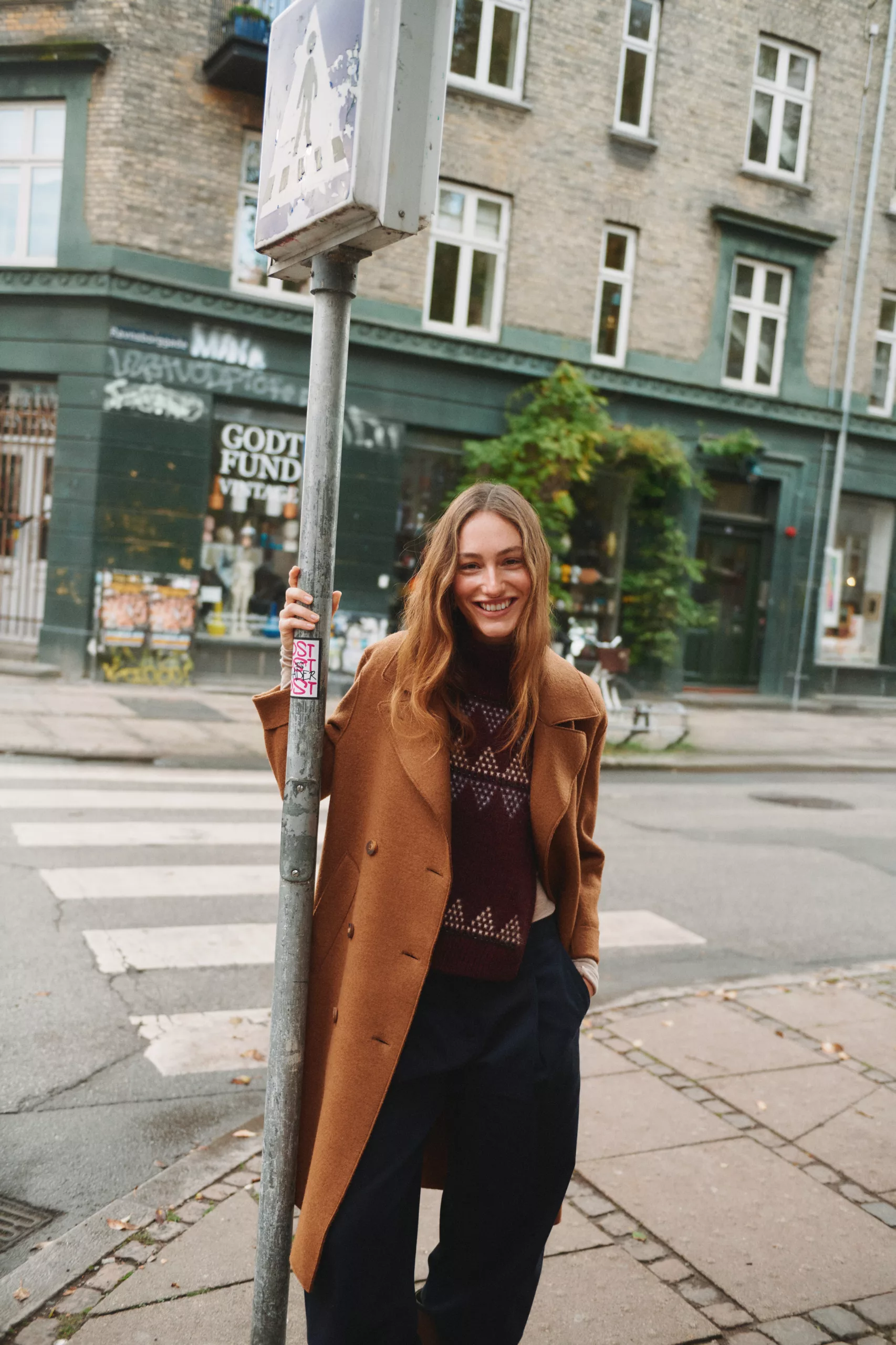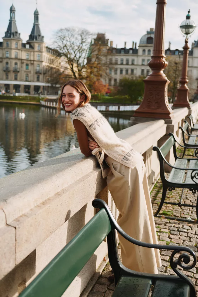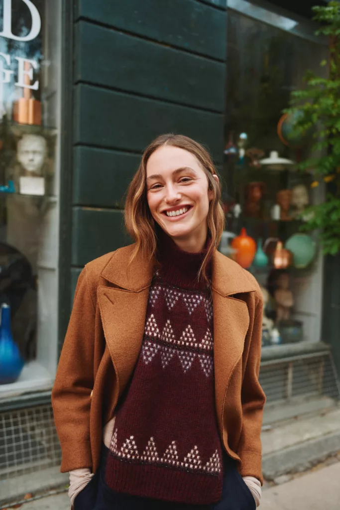 Für den Beth Warmer wurde Marianne Isagers Muster Kinaskak als Ausgangspunkt gewählt. Das charakteristische Spiel aus mehreren Farben und die feine Struktur des Originals bildeten die Grundlage für eine eigene, reduzierte Interpretation. Ziel war es, ein klares und ruhiges Gesamtbild zu schaffen, in dem ein neu entwickelter, dreifarbiger Musterrapport gut zur Geltung kommt und sich deutlich vom Hintergrund abhebt. Diese Idee zog sich durch den gesamten Entwurfsprozess und prägt den zurückhaltenden Ausdruck des Modells. Der Beth Warmer ist bewusst schlicht gehalten, sodass Muster und Textur für sich sprechen können. Das Design kann in zwei Varianten gestrickt werden: als offene Weste mit Bindebändern an den Seiten oder als Halswärmer. Beide Versionen eignen sich gut als zusätzliche Schicht unter dem Mantel oder als leichtes, elegantes Accessoire über Hemd oder Bluse an kühleren Tagen. Der Beth Warmer wird nahtlos von oben nach unten aus Isager Jensen Yarn, Isager Silk Mohair und Isager Soft gestrickt und kombiniert Webstricken mit glatten Partien.