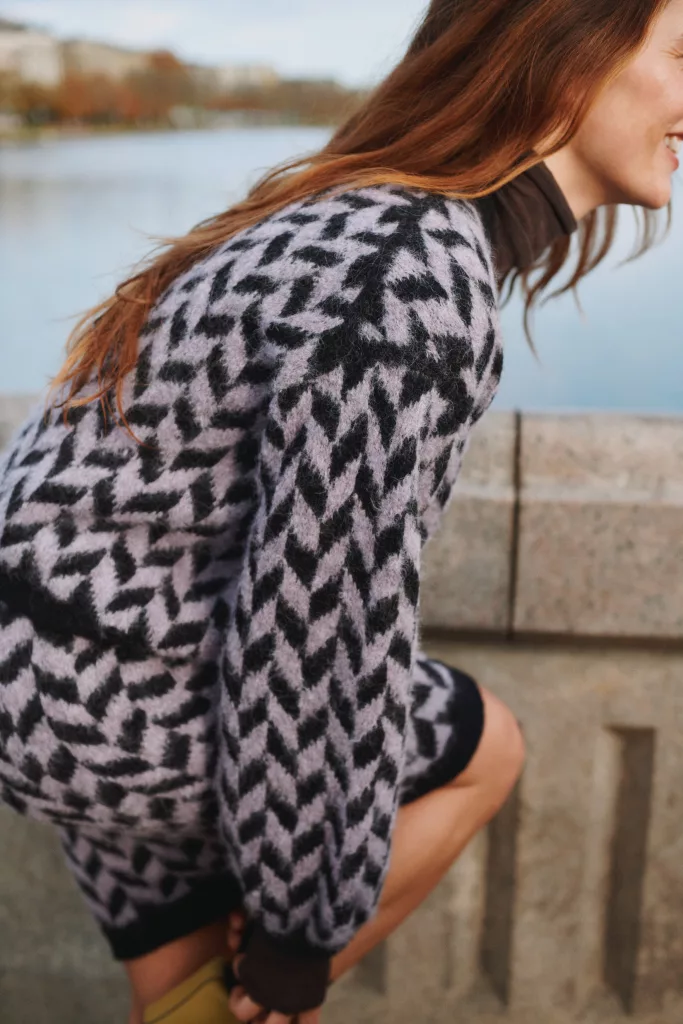 Ein wichtiger Teil dieser Weiterentwicklung ist die Kombination zweier sehr unterschiedlicher Garne. Isager Bouclé bringt eine weiche, leicht nostalgische Oberfläche ein, die spannend mit der klaren, geometrischen Struktur des Musters zusammenwirkt. Dieser Gegensatz – flauschig und strukturiert – zieht sich durch das gesamte Set. Die Mischung aus mattem Lila und tiefem Schwarz verstärkt diesen Eindruck und verbindet ein leicht retrohaftes Gefühl mit einem modernen Look.